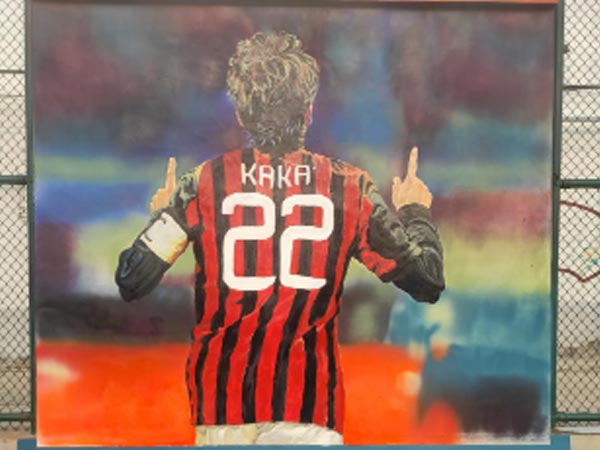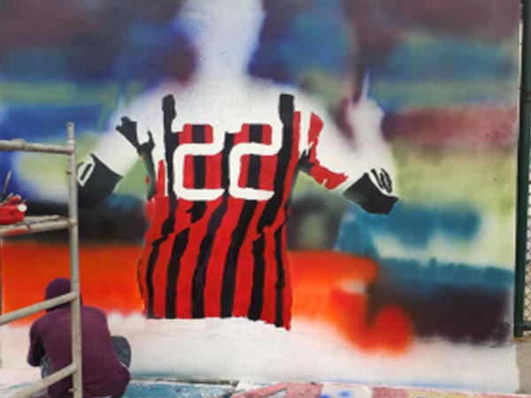 這是完成了三分之一的樣子,圖片的背景是足球場上的觀眾席,原圖背景是高度虛化的。主要突出前面的這名運動員,背景處理我們是用的噴槍。人物處理上我們選用的是先鋪色再找細節(jié)。我們從墻對面的熱心大媽家借了幾塊廣告牌,大媽聽說我們是給球場畫畫的很是熱心。