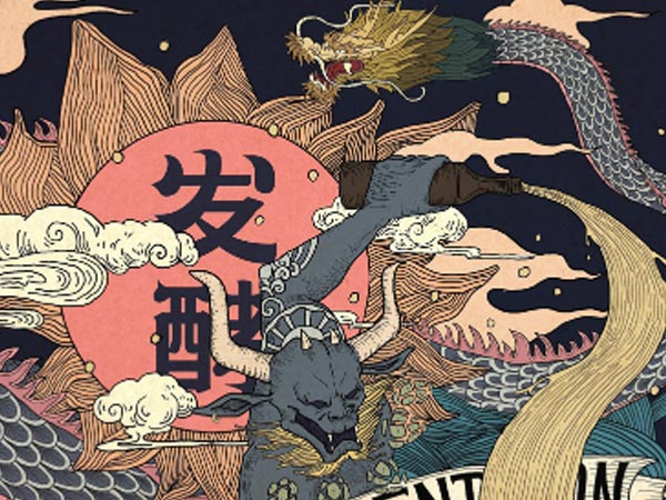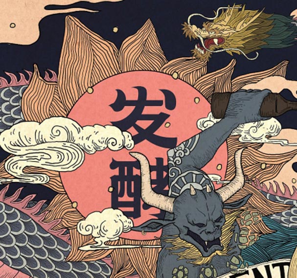 起筆的地方是從右上角開始,最先開始畫的是一個(gè)太陽加上發(fā)酵兩個(gè)字。“發(fā)酵”是整個(gè)釀酒環(huán)節(jié)最重要的步驟。如果說酒的品質(zhì)好壞是從選料開始的,那么發(fā)酵的過程就是決定一瓶酒品質(zhì)的絕對(duì)因素。所以我們決定將這個(gè)最關(guān)鍵的步驟加進(jìn)去。