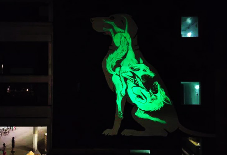 在加拿大巴黎歷史博物館旁的墻面上,有那樣一幅墻繪:大白天它是一幅凝視正前方、神氣十足的牧羊犬,夜里它展現(xiàn)出二只互相搏殺的野狐。全部著作的設(shè)計構(gòu)思來自,牧羊犬雖具捕獵野狐的本性,但卻對人們忠實而出名。