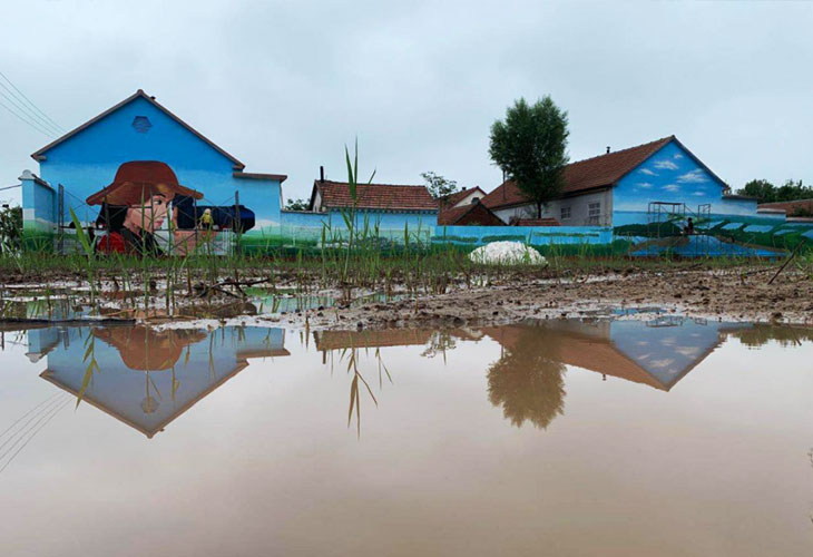 8月下旬之后天氣慢慢轉(zhuǎn)涼,雨水增多。給我們的畫(huà)師帶來(lái)了不少困難,連綿的雨天工程進(jìn)度一放再放,墻面潮濕也給墻繪繪畫(huà)施工時(shí)增加了不少難度。