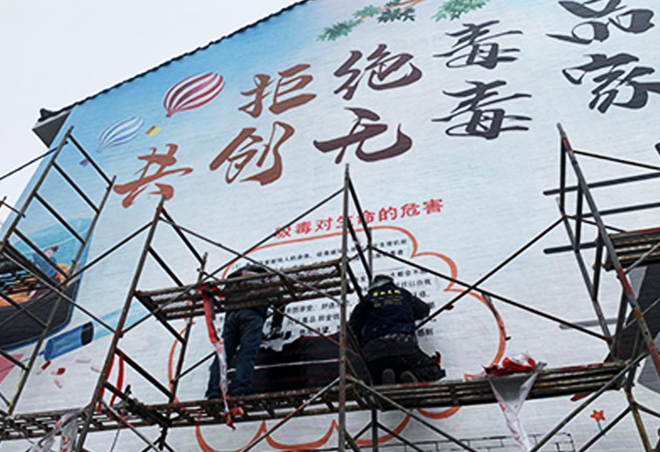 畫師們正在墻上繪制書寫關(guān)于毒品的危害
