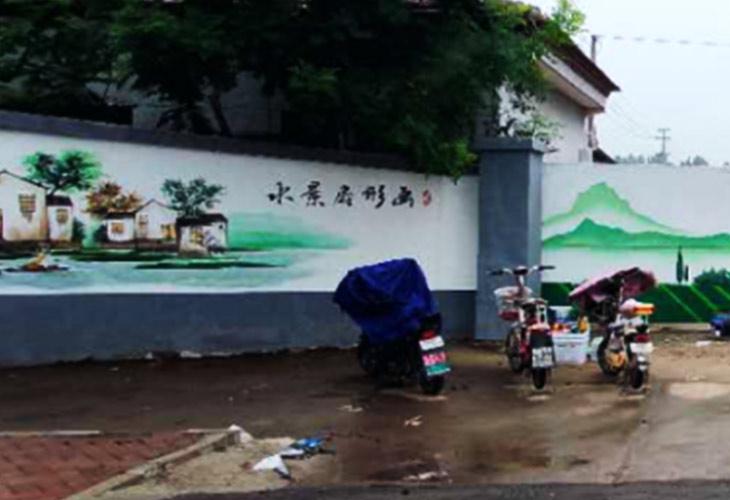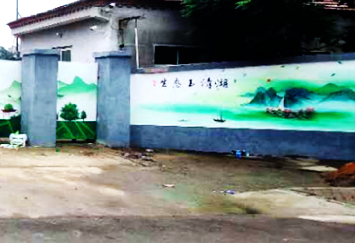 美化區(qū):原本光禿禿的墻面和大門經(jīng)過畫師的“打磨”從而出現(xiàn)了一面典雅的墻繪畫面——使得這里變得光鮮亮麗,一幅幅的水墨畫增添了這個(gè)村子的光彩。蕭鼓追隨村社近,衣冠簡樸古風(fēng)存。左邊是湖邊村落,水景扇形畫。