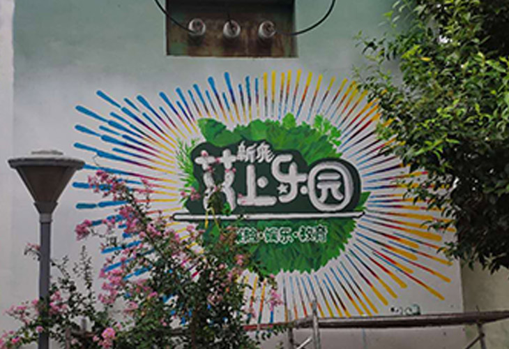 墻繪施工的地方是新龐村,這個(gè)村子是擠在玉清湖水庫、濟(jì)西濕地公園、小清河濕地公園南面的一座小村莊。村口有種植的一大片綠化進(jìn)來之后有幾個(gè)大院子,就是我們今天的主角 新龐——艾上樂園。